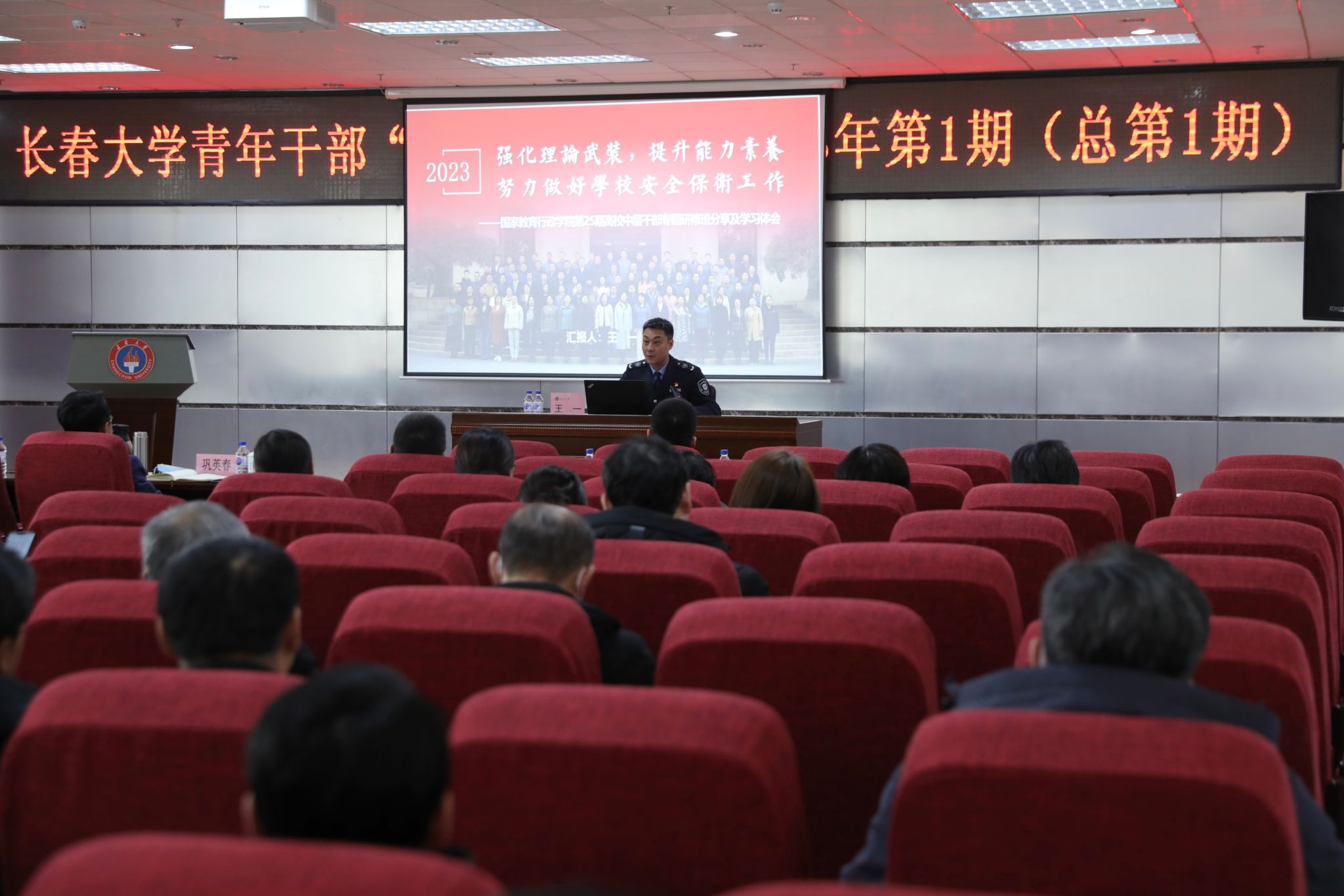 国家教育行政学院第25期高校中层干部专题研修班学员安全部(处)部(处)长、综合治理办公室主任王一同志以《强化理论武装,提升能力素养,努力做好学校安全保卫工作》为题作专题报告,以独特的视角和开阔的视野解析了高等教育高质量发展的时代内涵与实践路径,以及在此背景下高校安全工作的努力方向。他倡导大家努力成为想干事、能干事、干成事的好干部,在推动学校实现历史新跨越中展现新担当、新作为。