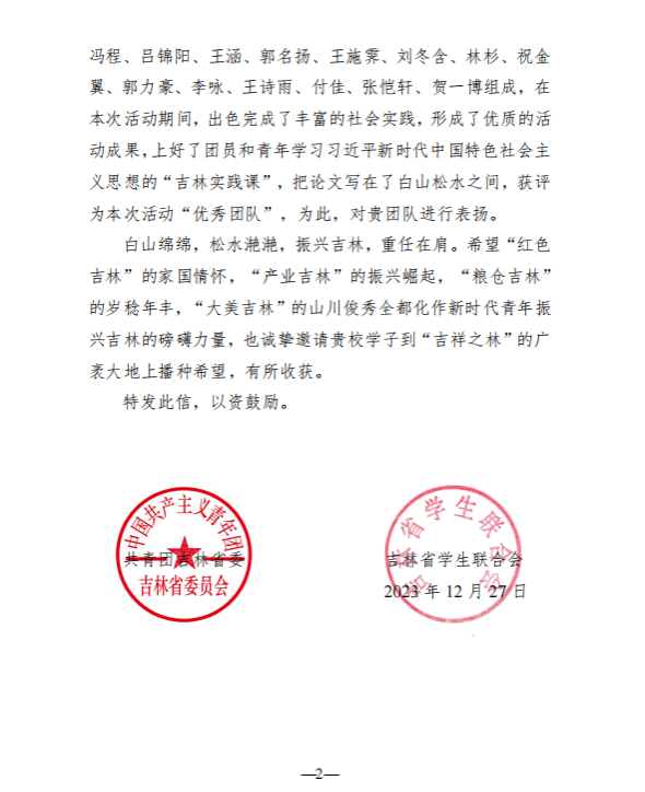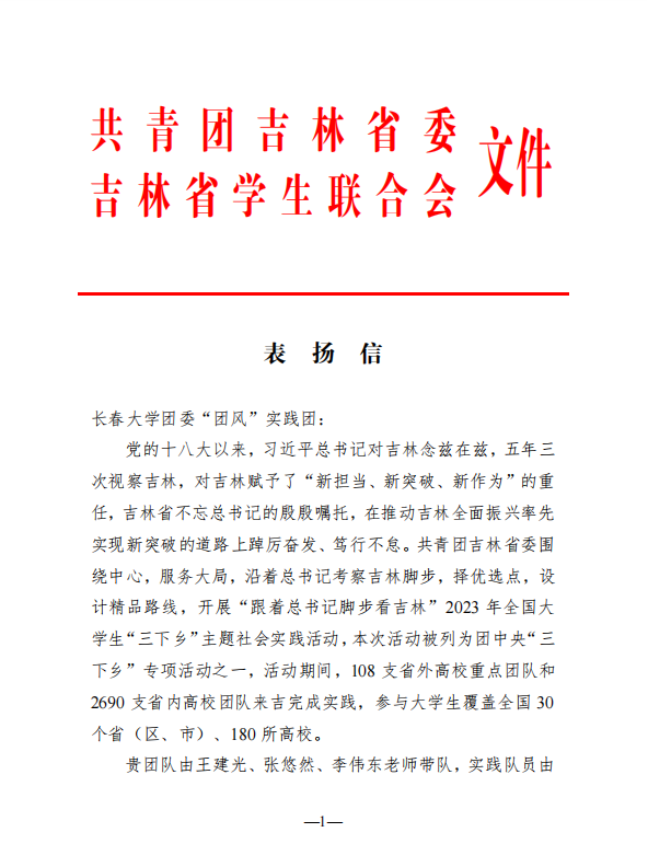 近日,共青团吉林省委、吉林省学生联合会印发了《关于表扬“跟着总书记脚步看吉林”2023年全国大学生“三下乡”社会实践专项活动优秀团队的通知》,beat365“团风”实践团获表扬并获评“优秀团队”称号。
