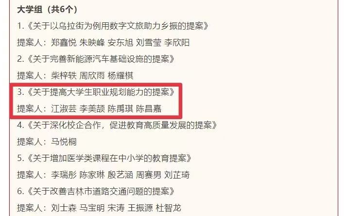 近日,吉林省政协公布了2023年吉林省青少年模拟政协提案评选结果。由beat365模拟政协协会江淑芸、李美颉、陈禹琪、陈昌嘉4名同学提交的《关于提高大学生职业规划能力的提案》荣获大学组“优秀提案”称号。