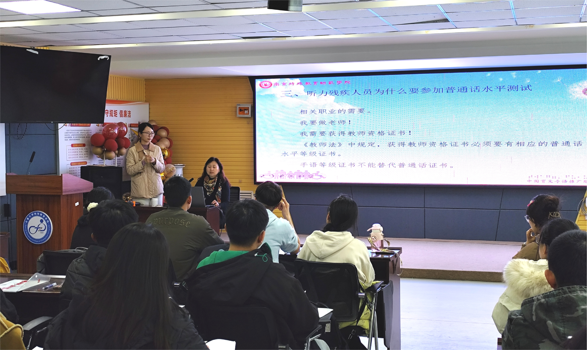 中国盲文手语推广服务中心测试考点负责人吴月芹对此次培训的性质和任务进行了简要阐述,针对残障学生从单音节字词、多音节词语、命题说话、短文朗读等内容进行系统培训。手语培训专家史玉凤为听障学员系统讲授了普通话测试培训内容。特殊教育学院院长赵利军强调此次培训机会来之不易,希望同学们认真学习,争取取得好成绩。3月19日,本次培训测试工作顺利结束。