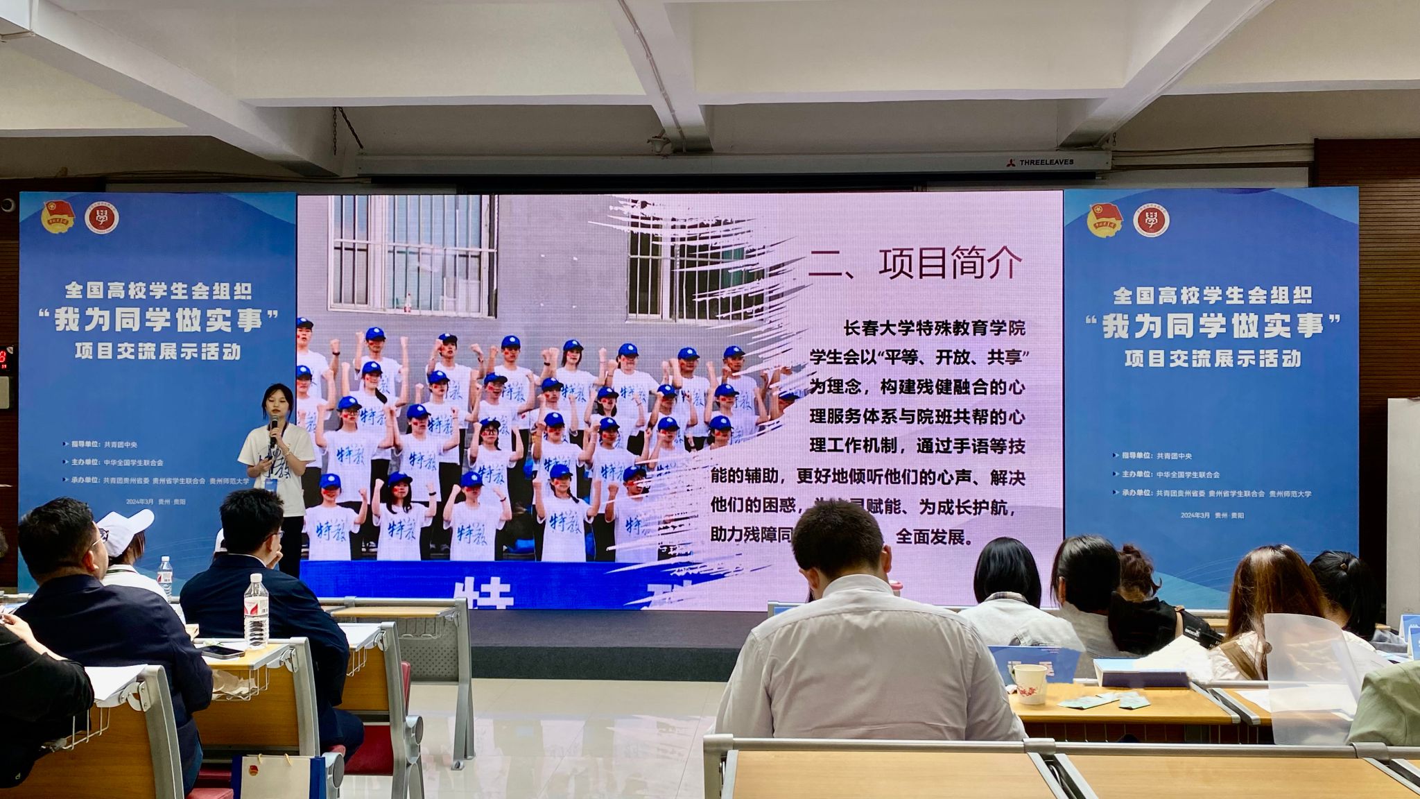 3月23—24日,由共青团中央指导,全国学联主办,团贵州省委、贵州省学联、贵州师范大学承办“我为同学做实事”项目交流展示活动在贵阳举行,活动主题为“学思想·做实事·树新风”,团中央书记处第一书记阿东出席活动现场。beat365特殊教育学院学生会项目“‘心’福你我相伴——同学心理健康帮扶项目”被评为“精品项目”“最受同学欢迎项目”,是吉林省高校中获得两项荣誉的唯一高校。