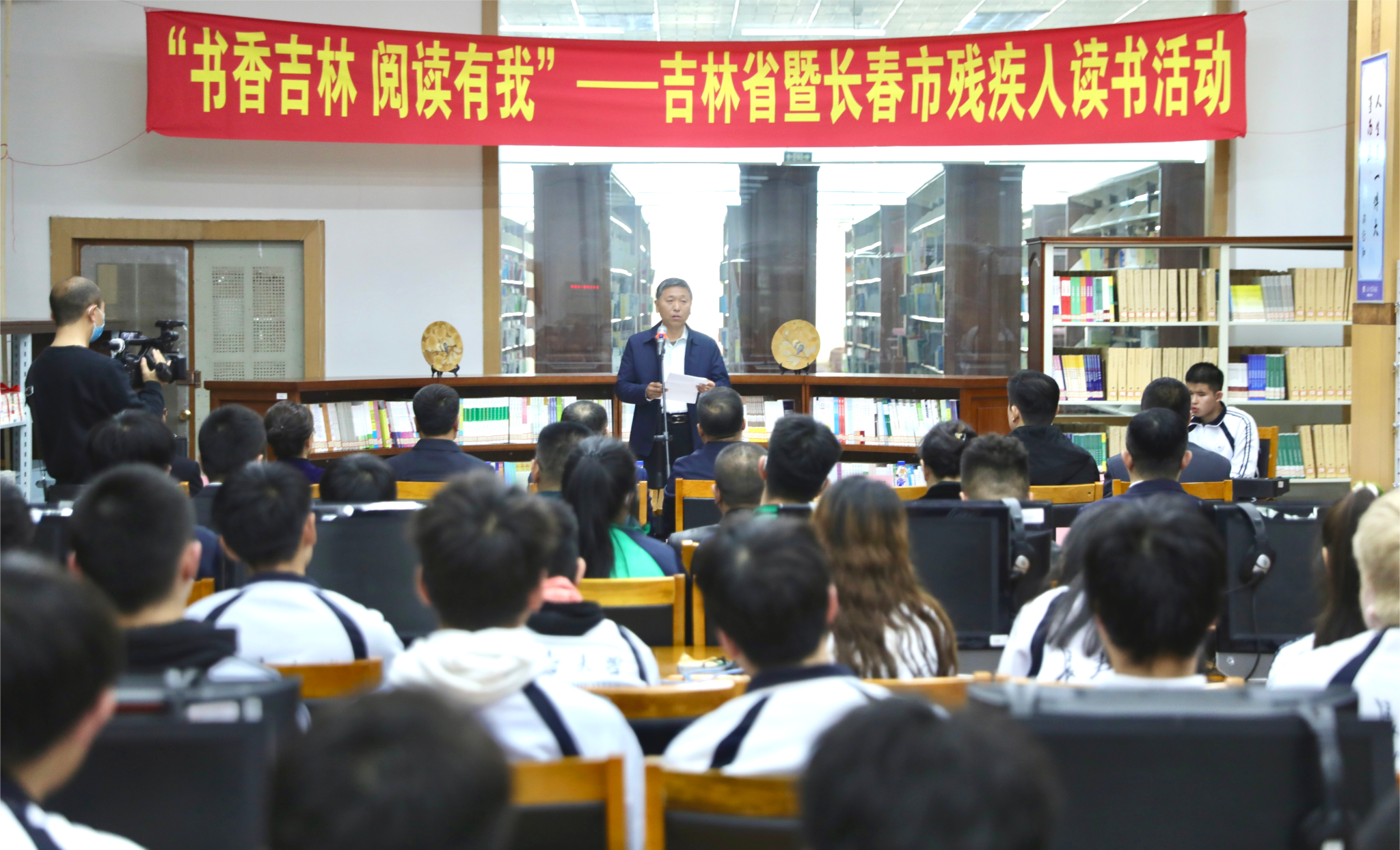 为贯彻落实习近平总书记关于推动全民阅读、建设书香社会的重要指示精神,努力在全省残疾人中营造爱读书、读好书、善读书的良好氛围和时代风尚,进一步满足残疾人精神文化需求。4月23日下午,由省残联、长春市残联主办,特殊教育学院、吉林省残疾人文联、吉林省全民阅读协会省残联分会联合承办的“书香吉林 阅读有我”吉林省暨长春市残疾人读书活动在学校盲文图书馆举行。吉林省残疾人联合会副理事长张振英、吉林省全民阅读协会会长赵云良、长春市残疾人联合会党组书记、理事长王俊飞、学校副校长张洪杰、特殊教育学院和图书馆负责同志参加了活动。