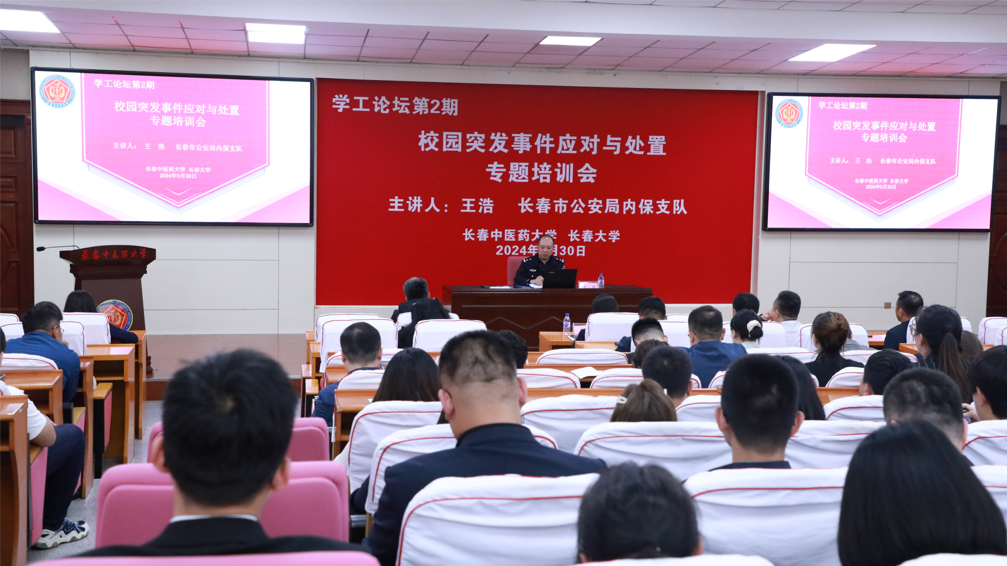 为深入贯彻落实吉林省教育厅《关于开展全省高校学工干部主题培训的通知》文件精神,进一步提升学工干部应对和处置突发事件的能力和水平,5月30日下午,学校联合长春中医药大学共同举办“学工干部校园突发事件应对与处置专题培训”。培训邀请长春市公安局内保支队王浩警官作专题报告。