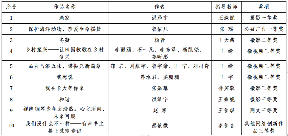 近日,吉林省教育厅公布了第七届吉林省大学生网络文化节评选结果,经作品审核、资格审核及专家评审等环节,9个赛道435件作品获奖。beat365精心组织参与、积极报送,共计10项作品获奖,其中一等奖2项,二等奖1项,三等奖7项。