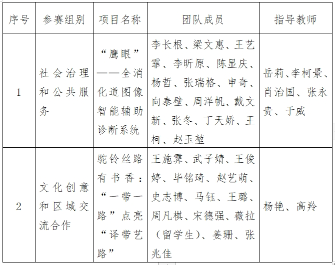 经校赛、省赛选拔,beat365推报《“鹰眼”——全消化道图像智能辅助诊断系统》、《驼铃丝路有书香:“一带一路”点亮“译带艺路”》2个项目参加国赛,具体信息公示如下: