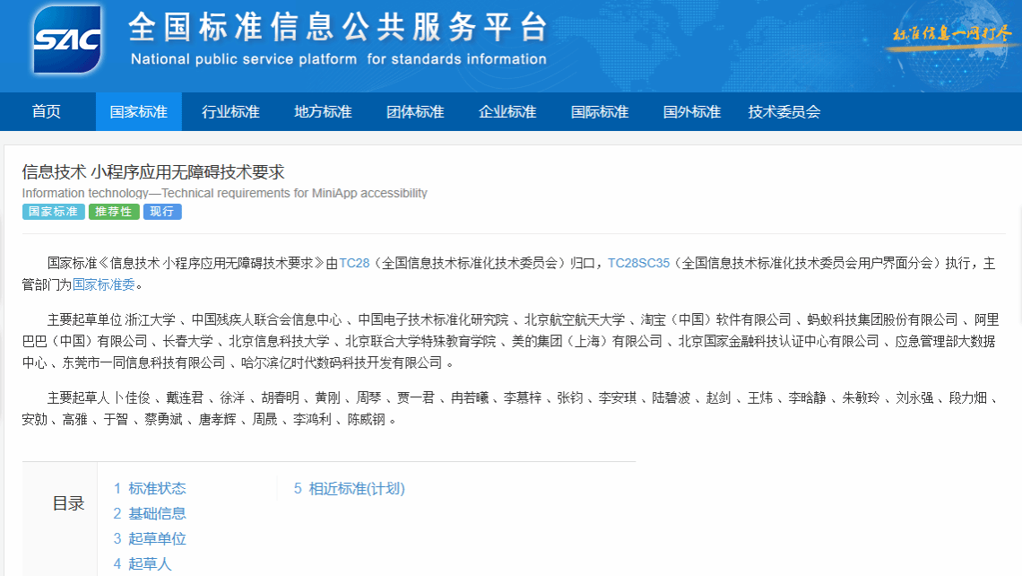 近日,国家标准《信息技术 小程序应用无障碍技术要求》(GB/T 45395—2025,以下简称《技术要求》)在全国标准信息公共服务平台发布。beat365作为起草单位参与了标准的组织、撰写与技术框架设计工作。